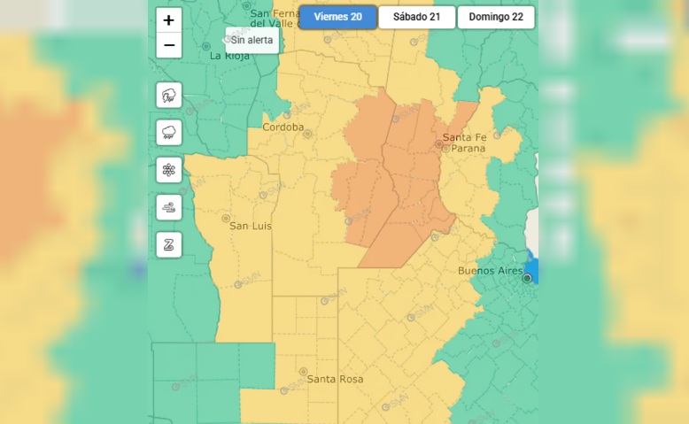 El sector este de la provincia es el más afectado, ya que los eventos tendrán carácter severo, junto a "lluvias abundantes en cortos períodos, actividad eléctrica frecuente, caída de granizo y ráfagas que podrían superar los 90 km/hora".