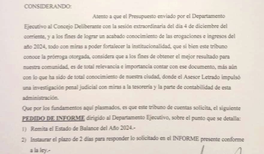 a los fines de lograr un acabado conocimiento de las erogaciones e ingresos del año 2024, todo con miras a poder fortalecer la institucionalidad, que si bien este tribuno conoce la prórroga otorgada, considera que a los fines de obtener el mejor resultado para nuestra comunidad, es de total relevancia e importancia contar con ese documento, más aún con lo que ha sido de total conocimiento de nuestra ciudad, donde el Asesor Letrado impulsó una investigación penal judicial con miras a la tesorería y la parte de contabilidad de esta administración.